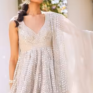 Elegant Ivory Chanderi Lurex & Mirror Embroidered Anarkali With Pants & Dupatta – Festive Ethnic Set