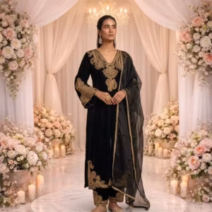 Black Velvet Zardosi Hand Embroidered Kurta Set with Pants & Dupatta | CoutureCraze Wedding & Festive Wear