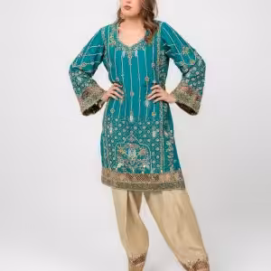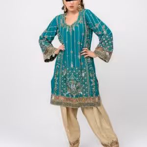 Luxury Teal Hand-Embroidered Ethnic Dress with Golden Embroidery