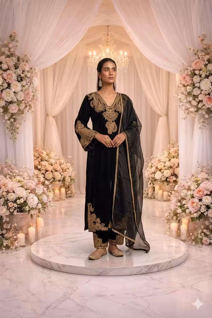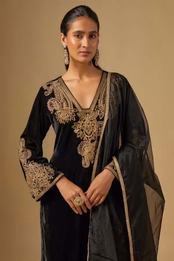The deep black shade gives a powerful and sophisticated look, ideal for evening events, weddings, and festive celebrations. Velvet kurta sets are especially popular for winter occasions due to their luxurious texture and warmth, making them a must-have for festive wardrobes.