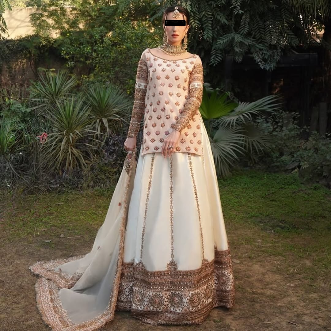 This luxurious set includes a heavily embroidered blouse, a full-circle lehenga with intricate border detailing, and a matching dupatta finished with golden embroidery. Additionally, the comfortable inner lining ensures ease of movement while maintaining the outfit’s stunning silhouette. Because every bride deserves perfection, this CoutureCraze creation delivers unmatched elegance.