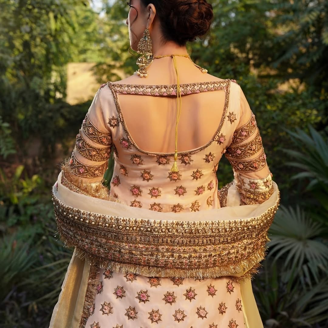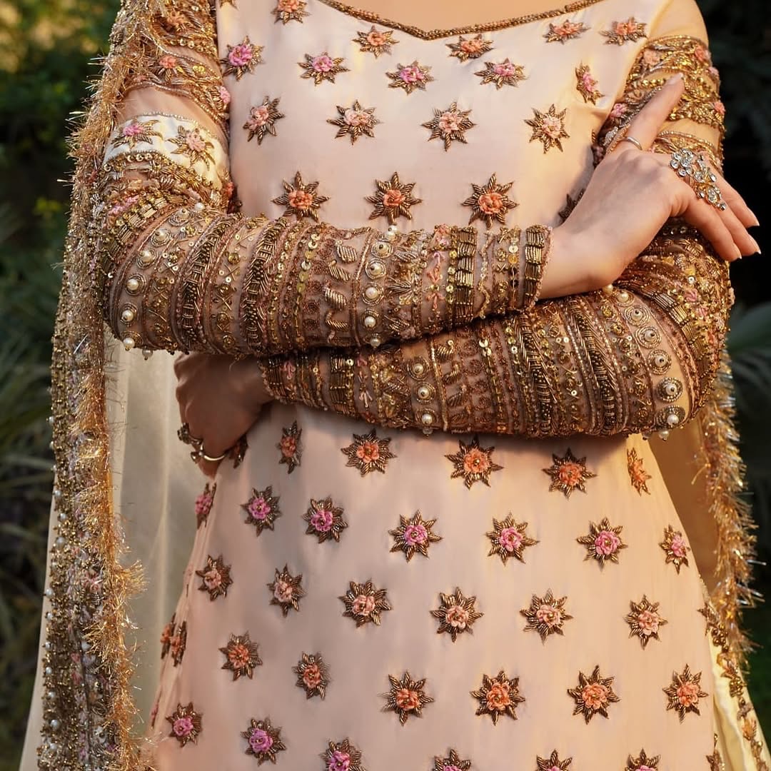 Embroidery: Heavy golden threadwork with star and floral motifs