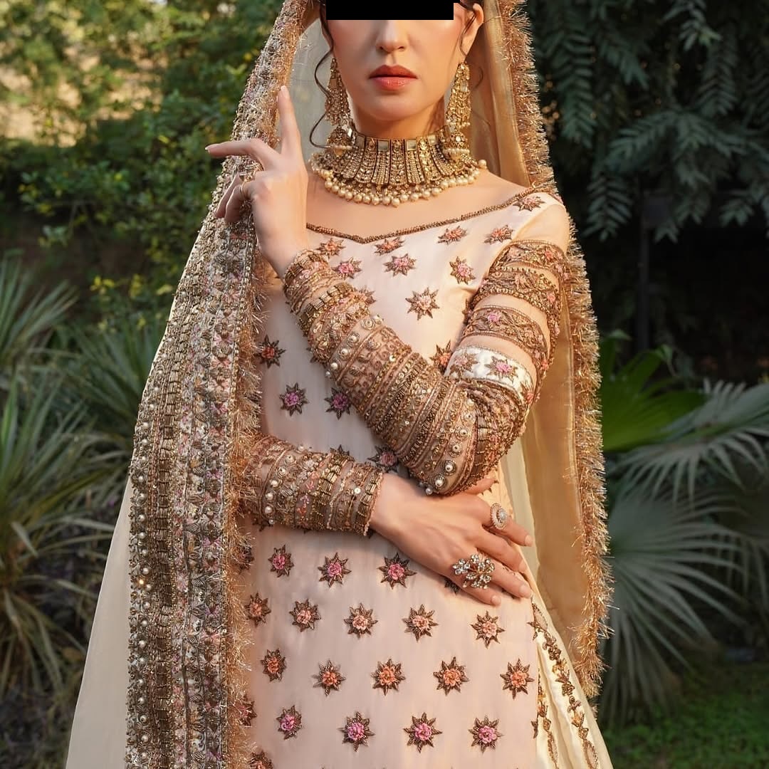 Step into elegance with this breathtaking Blush Pink Gold Heavy Embroidered Lehenga Set from CoutureCraze. The soft blush pink base showcases exquisite golden star motifs and intricate threadwork throughout, creating an ensemble that epitomizes bridal grandeur. This designer lehenga promises to make every moment unforgettable at your special celebration.