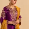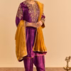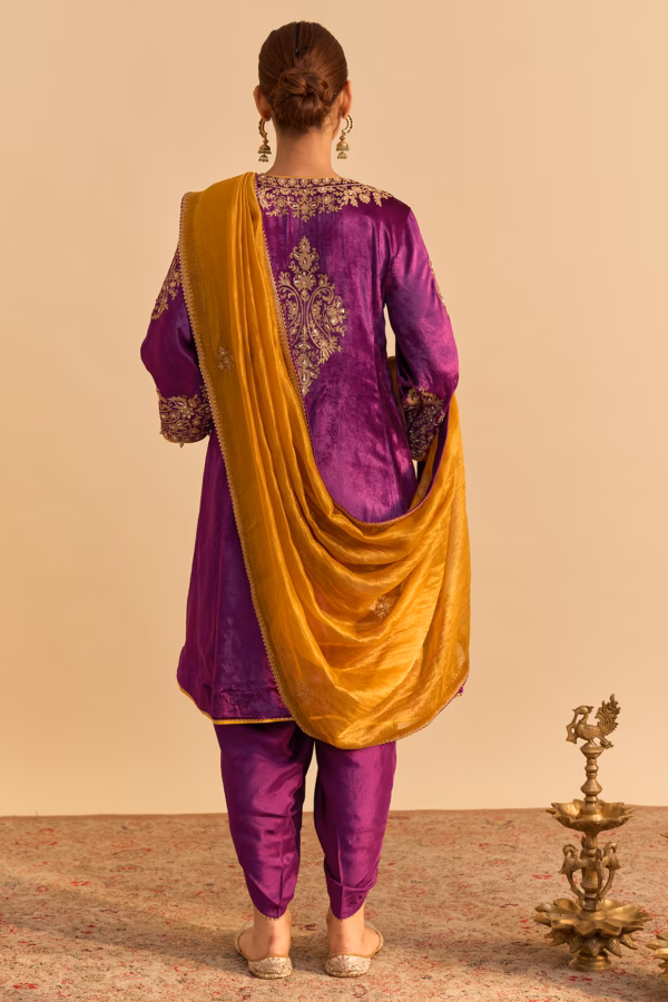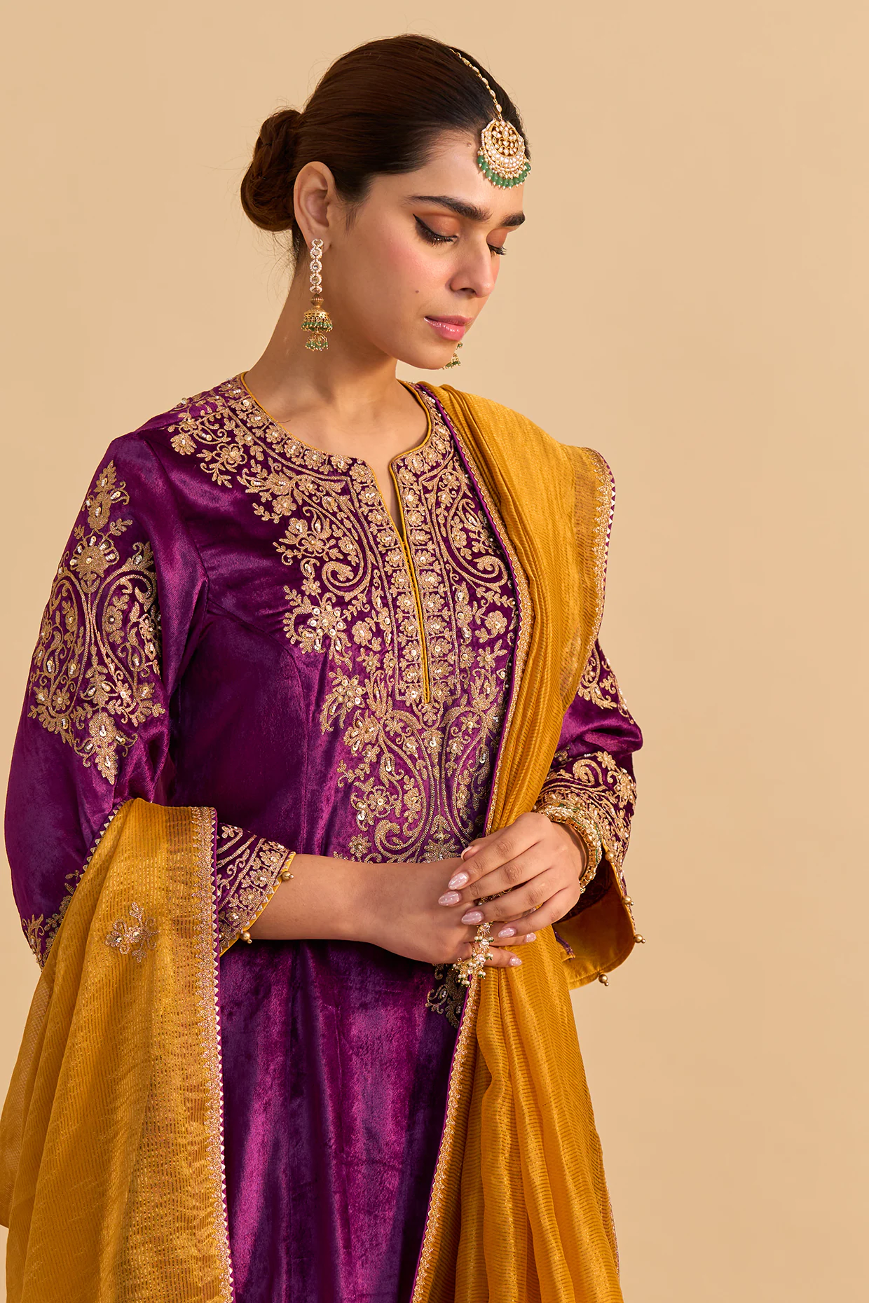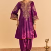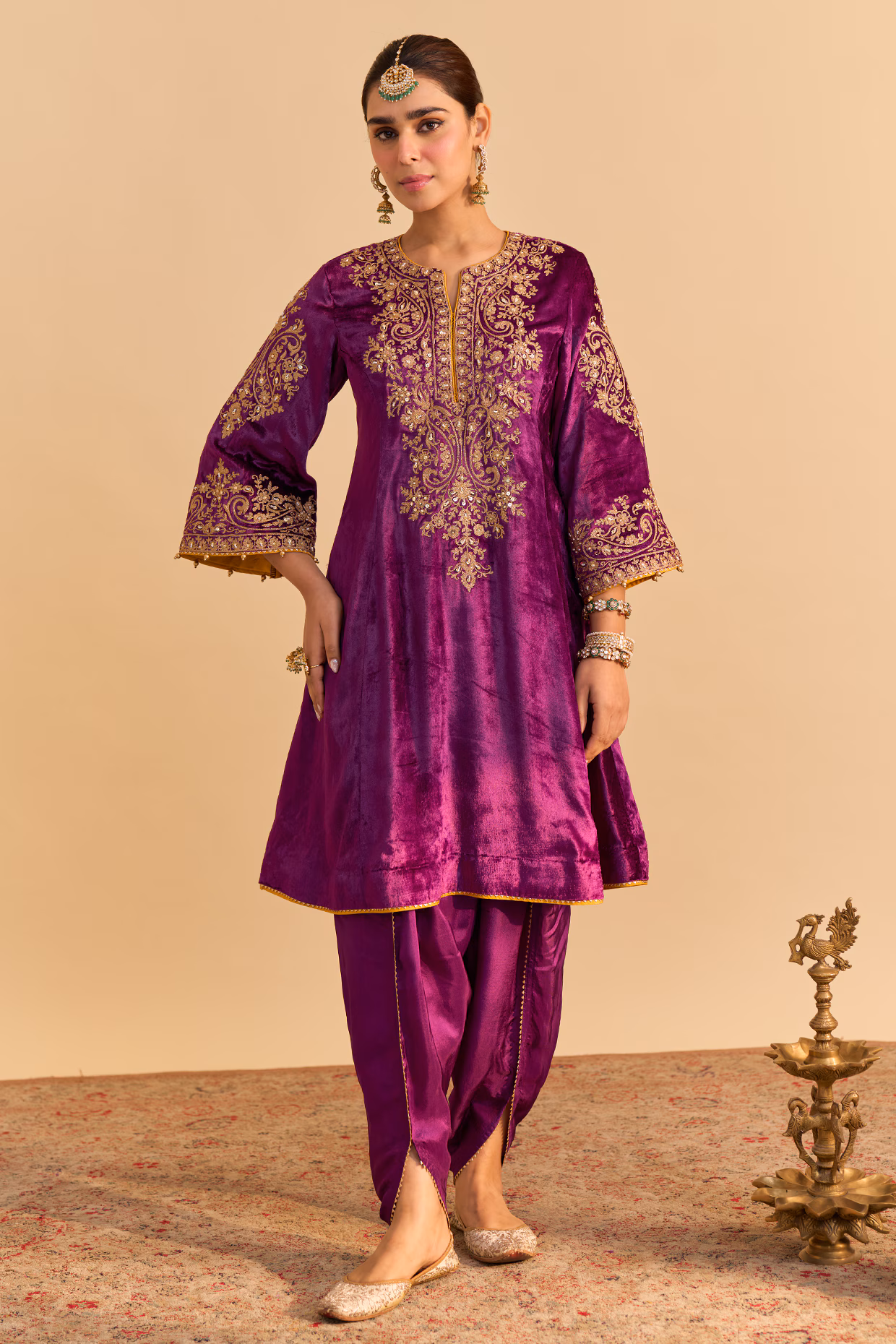 Deep Purple Velvet Silk Embroidered A-Line Kurta Set with Dhoti Pants & Dupatta | CoutureCraze Festive Wear