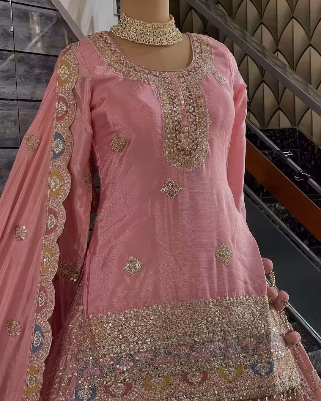 Transform into a vision of elegance with our Designer Pink Gold Embroidered Lehenga Set. Moreover, this breathtaking ensemble combines traditional craftsmanship with contemporary glamour. Additionally, every detail is meticulously crafted to ensure you shine at your most special moments.