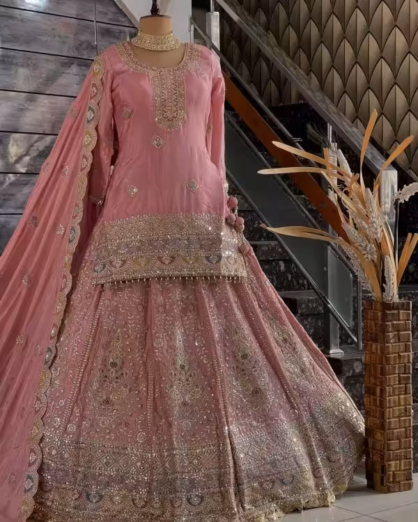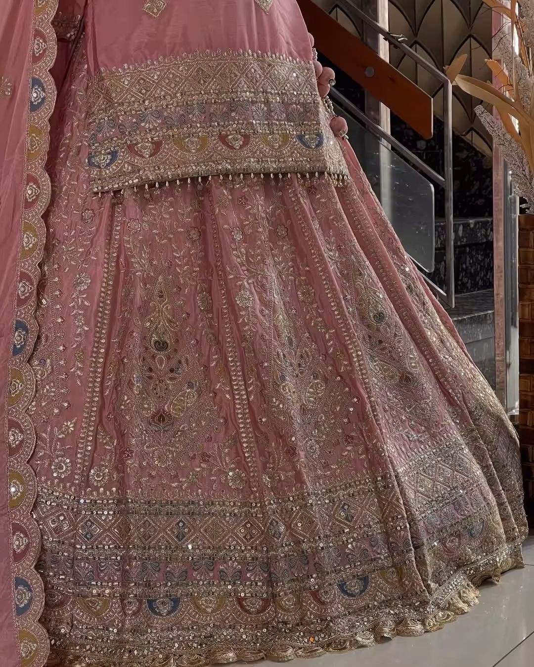 Exquisite Pink Gold Embroidered Lehenga Set – Bridal Collection