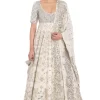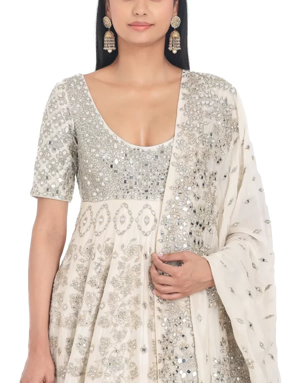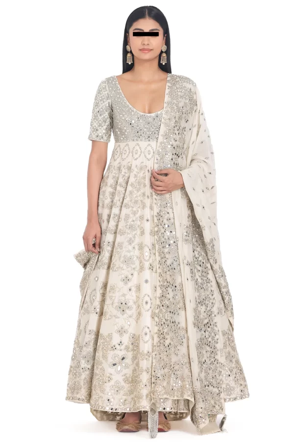 Step into the festive season with this elegant ivory anarkali set crafted in rich Chanderi fabric blended with lurex for a subtle shimmer. The bodice and flared skirt showcase refined mirror-embroidery that catches the light softly, adding just the right sparkle for celebrations. Paired with matching straight-cut pants and a flowing chiffon dupatta, this ensemble balances traditional charm with contemporary ease. The fitted bust and waist give structure, while the skirt drapes beautifully for movement and grace. Ideal for weddings, festivals, or special gatherings, it’s a timeless addition to your ethnic wardrobe. Finished with dry-clean only care for longevity.