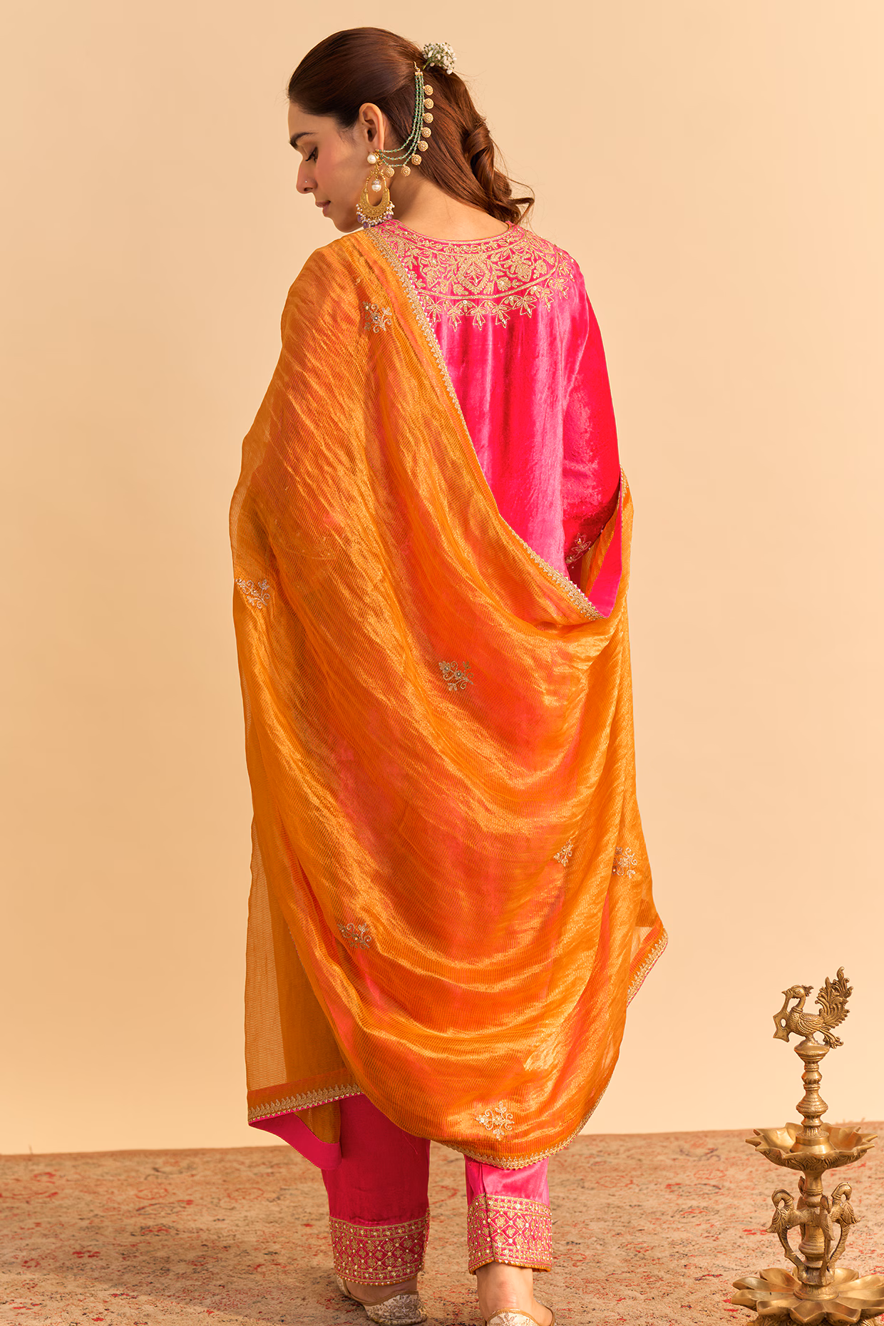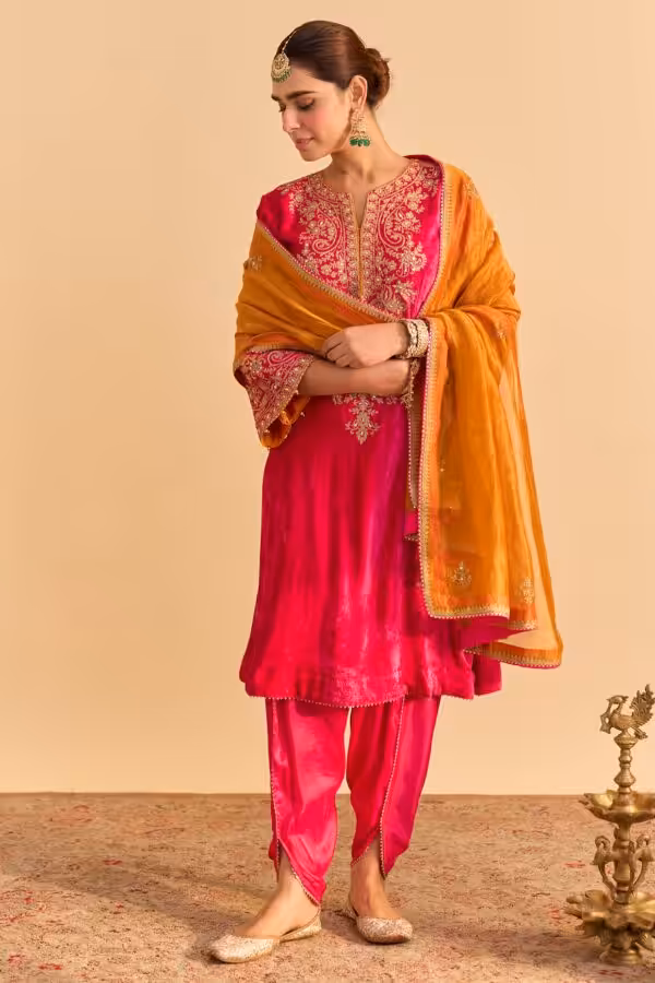 Crafted in premium velvet silk, the kurta features intricate embroidery using sequins, pearls, and aari tilla work. These handcrafted details add depth, shine, and a luxurious finish. The outfit comes paired with stylish tulip dhoti pants that give a modern twist to traditional wear. A lightweight tissue silk dupatta completes the ensemble, adding softness and balance to the overall look.