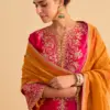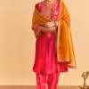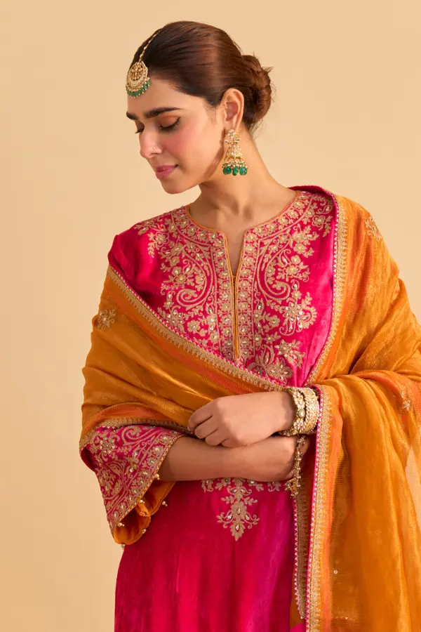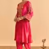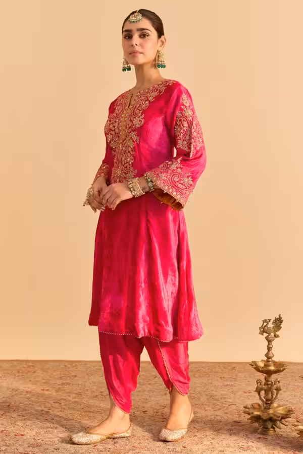 Step into festive elegance with this hot pink velvet silk embroidered kurta set from CoutureCraze. This outfit blends rich texture with detailed craftsmanship, creating a bold yet graceful ethnic look. The A-line kurta enhances your silhouette while offering a flattering and comfortable fit for long celebrations.