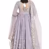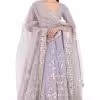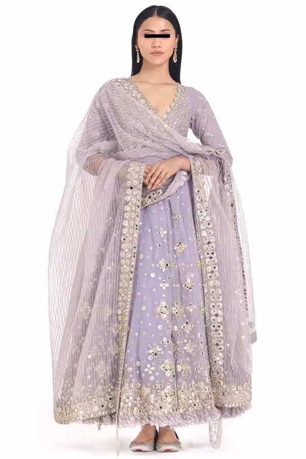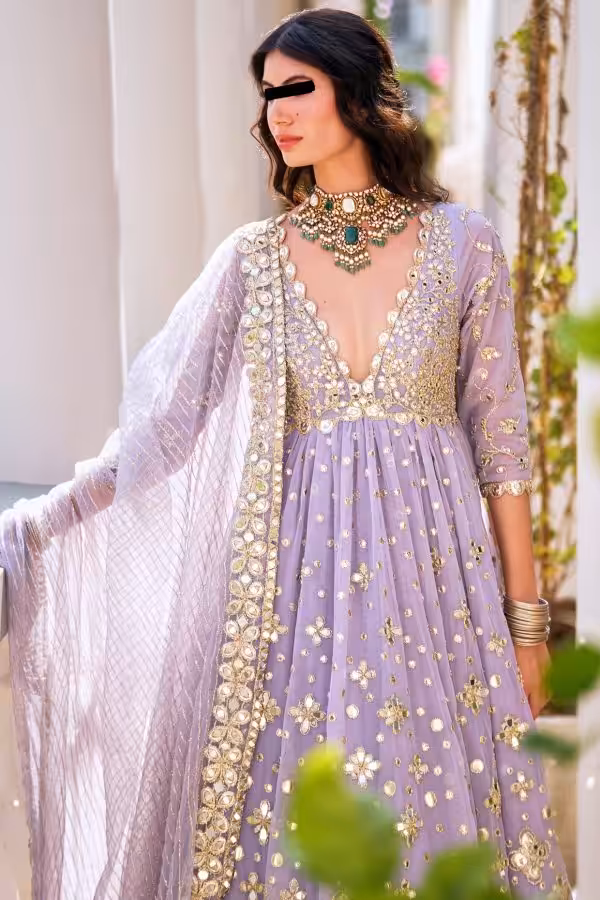 This Lilac Mirror Anarkali in soft net creates a pastel glow at weddings and festive events. It features bright mirror embroidery that sparks under light, a fitted bust and waist for shape, and a gentle flare for movement. The set comes with coordinated pants and a matching net dupatta, so you step out fully styled. For a polished look, add minimal jewelry and heels. Moreover, the lilac tone pairs well with gold or silver accessories.