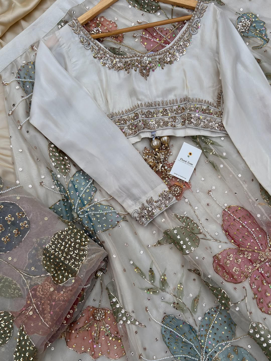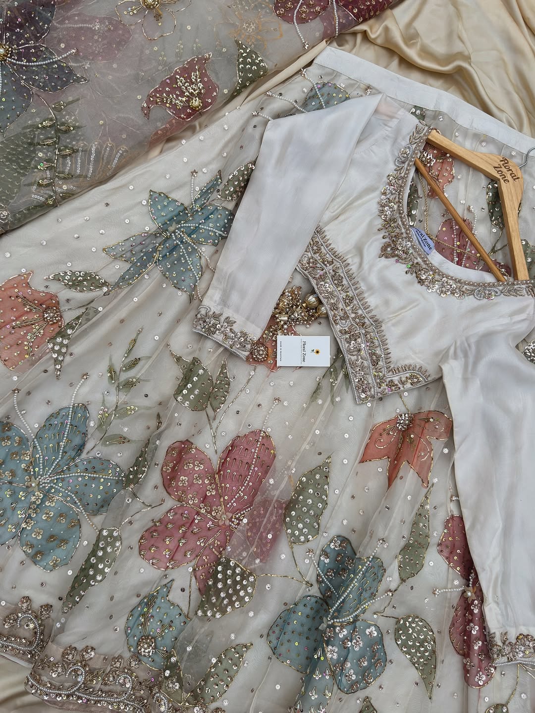 Step into charm and sophistication with our Luxury Pastel Floral Embroidered Lehenga Set. This exquisite ensemble features an ivory base, beautifully adorned with hand-embroidered pastel flowers in soft pink, green, and blue. Because of the detailed sequin and bead embellishments throughout, your outfit will shimmer delicately at every celebration.