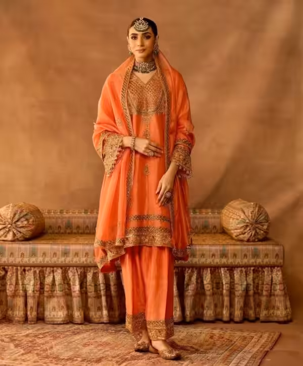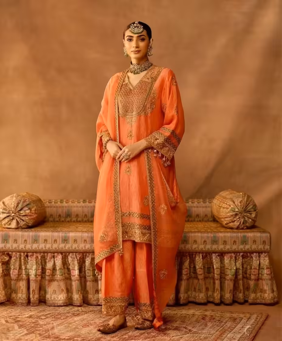 • Embroidery: Heavy gold zari, sequins, and beadwork creating a luxury finish