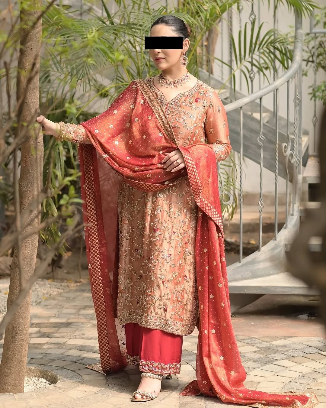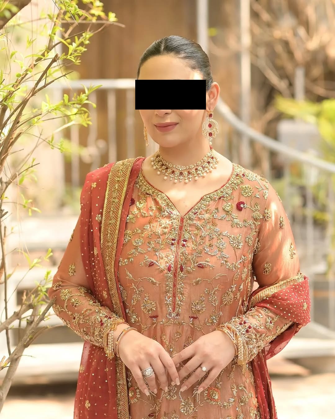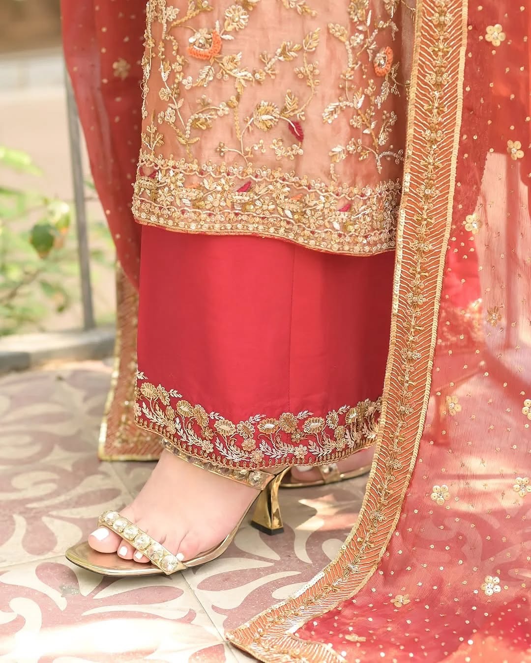 This peach gold embroidered suit from CoutureCraze keeps Indian tradition alive in a fresh and wearable way. Light peach fabric serves as the base, covered with intricate golden and maroon embroidery work. The embroidery features floral and paisley designs that create visual depth without overwhelming the outfit.
