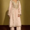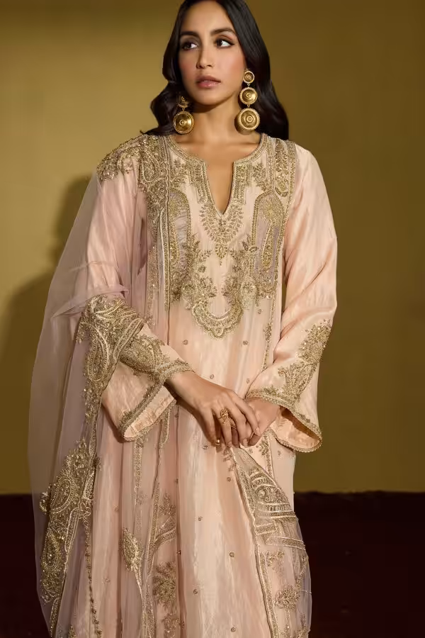 This Peach Gold Tissue Silk Kurta Set creates a balanced silhouette. It looks festive yet refined. The coordinated bottoms complete the ensemble and provide a structured, polished finish.