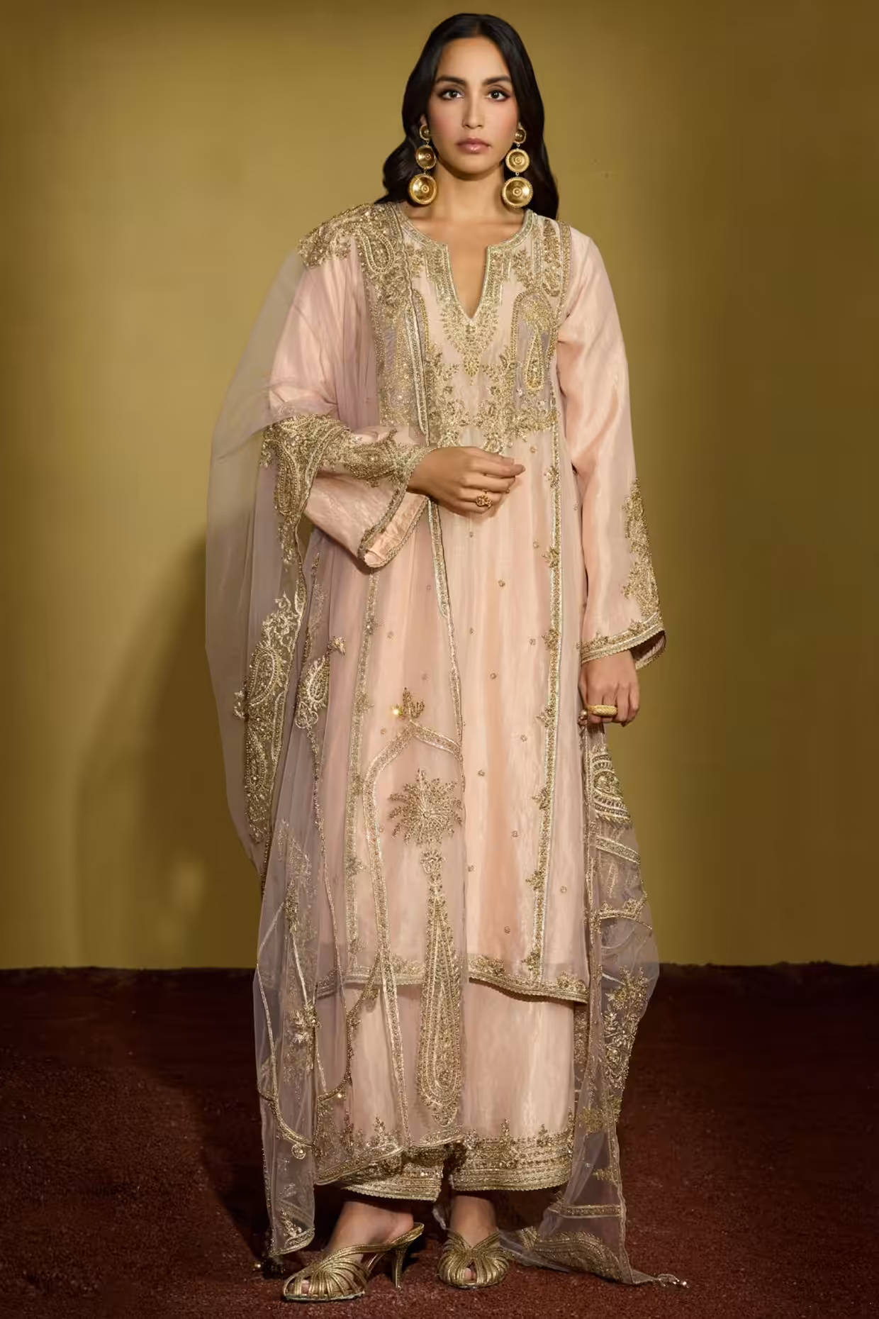 The peach gold tone reflects warmth and sophistication. This colour works beautifully for daytime wedding functions, roka ceremonies, haldi events, festive pujas, Eid celebrations, and Diwali parties. It offers a graceful festive glow without appearing too heavy.