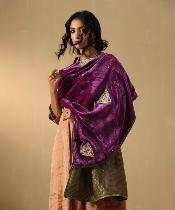 Perfect for draping over sarees, lehengas, or anarkalis, this Purple Mauve Zardozi Silk Velvet Doshala merges timeless style with artistic details. It’s an essential piece for anyone looking to add a touch of tradition and luxury to their wardrobe.