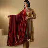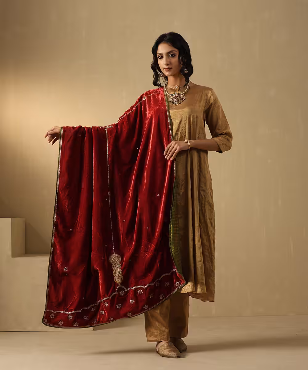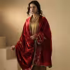 Add timeless elegance to your winter wardrobe with CoutureCraze’s Red and Maroon Hand Embroidered Zardozi Silk Velvet Doshala. Skilled Farrukhabad artisans craft this luxurious doshala with intricate gold and silver zardozi embroidery, featuring floral motifs inspired by Mughal artistry. Made from soft silk velvet, its rich red and maroon hues bring warmth and charm. For example, the Chanderi tissue border adds a delicate touch. This doshala is perfect for weddings, festive events, or styling over sarees and lehengas for a regal look.