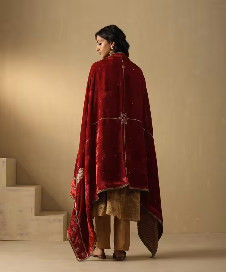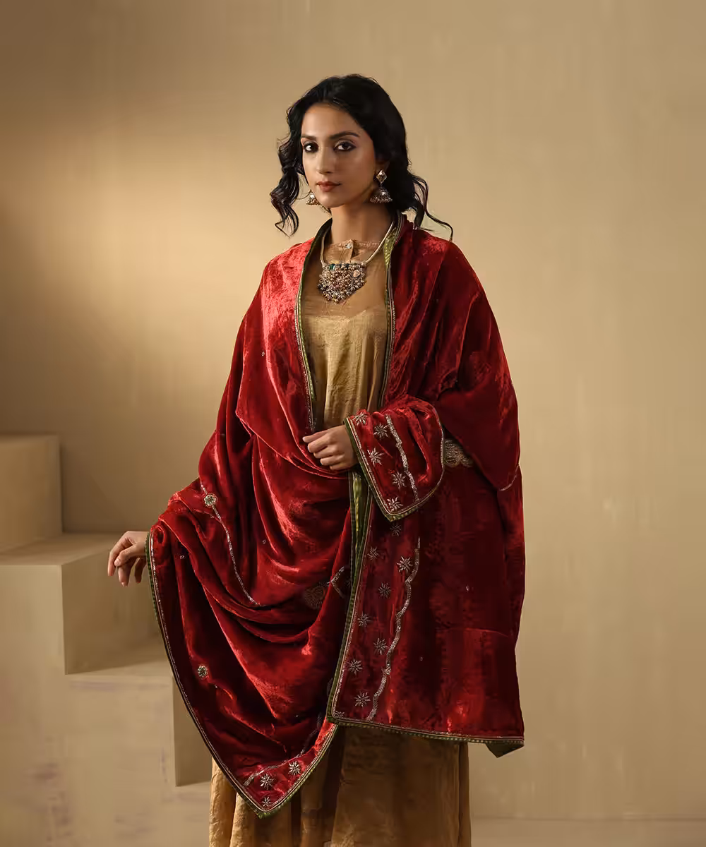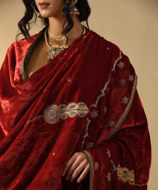Red and Maroon Hand Embroidered Zardozi Silk Velvet Doshala