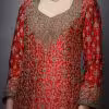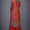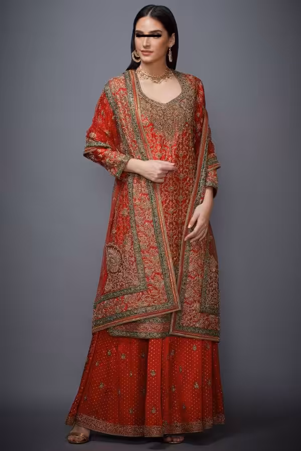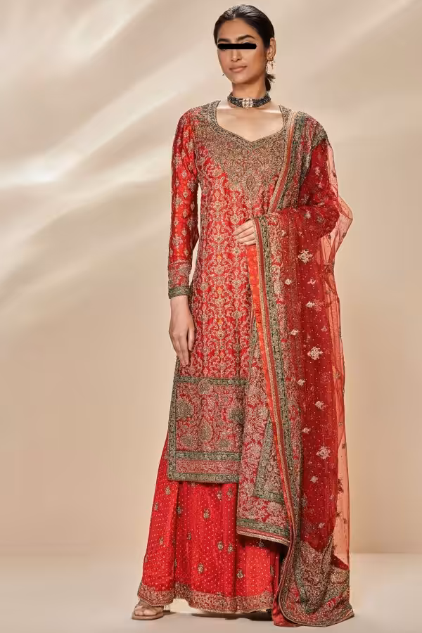 Delicate yet detailed embroidery enhances the neckline and sleeves. The design draws inspiration from Indian craftsmanship and festive tradition. The embroidered patterns complement the bold hues, creating a rich festive look without overpowering the overall appeal.