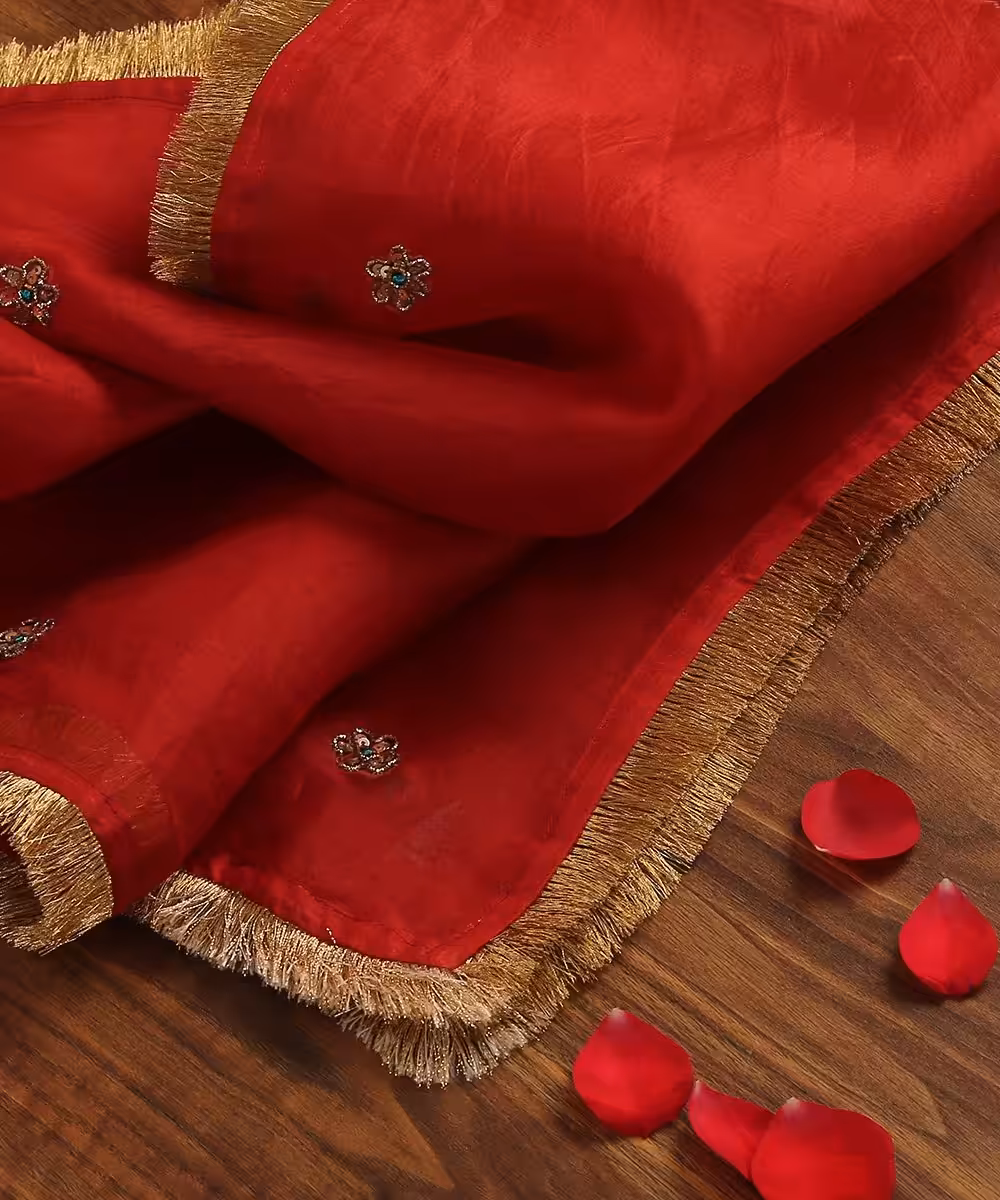 Red Handloom Organza Dupatta with Hand-Embroidered Zardozi