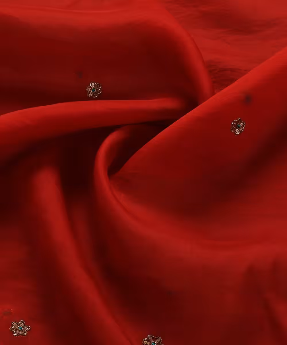 Adorned with intricate zardozi embroidery, this dupatta features exquisite floral and vine patterns, meticulously crafted by skilled artisans using metallic threads. The shimmering embroidery against the red organza creates a mesmerizing effect, adding a regal, sophisticated charm. Every detail reflects the dedication to quality and tradition, ensuring each piece stands out.
