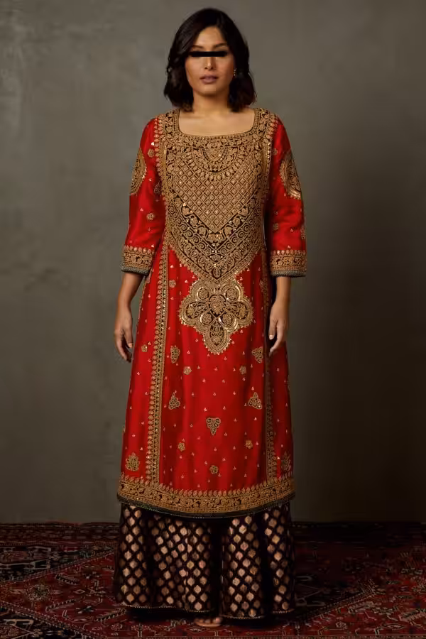 This Red Silk Embroidered Kurta Set pairs effortlessly with statement jhumkas, embroidered juttis, or traditional heels. Add a clutch or light dupatta styling for a complete festive look.