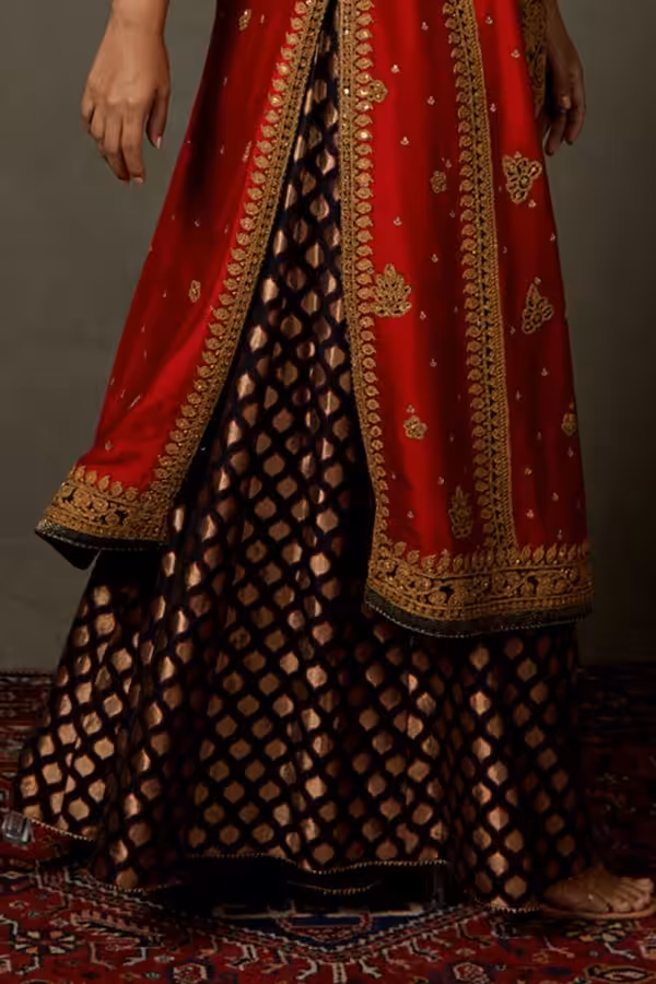 The vibrant red colour symbolises prosperity, joy, and celebration in Indian culture. This makes the outfit perfect for wedding functions, engagement ceremonies, festive pujas, Diwali gatherings, and Eid celebrations. The shade stands out beautifully in both daytime and evening events.