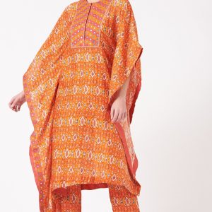 Orange Embroidered Ikat Kaftan Kurta Set