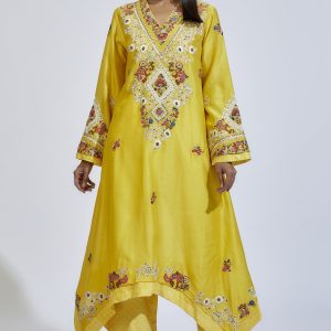 Mustard Asymmetrical Kurta Set With Embroidery
