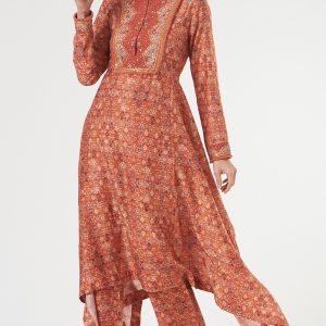 Brick Red Printed Asymmetrical Kurta Set